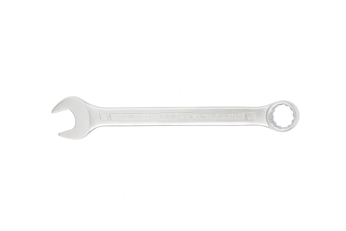 Ключ комбинированный торговой марки GROSS предназначен для монтажа/демонтажа резьбовых соединений. Изготовлен из высококачественной хромованадиевой (Crv) стали методом холодного штампа.Твердость 45-48 HRC. Ключ с одной стороны оснащен захватом открытого типа рожковым и накидным (кольцевым) с другой стороны. Профиль кольцевого зева имеет 12 граней, что увеличивает площадь соприкосновения рабочих поверхностей и снижает риск деформации граней крепежа при монтаже. Угол наклона кольцевого зева относительно плоскости ключа в 15 градусов делает монтаж более удобным. Хромоникелевое покрытие ключа улучшает антикоррозийные свойства инструмента.
